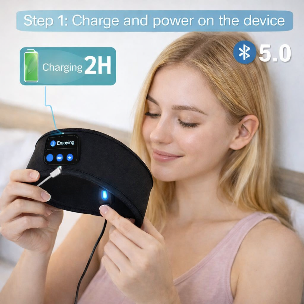 Before first use, charge the headband for approximately 2 hours. Once charged, press and hold the power button until the indicator shows that Bluetooth 5.0 is active.
