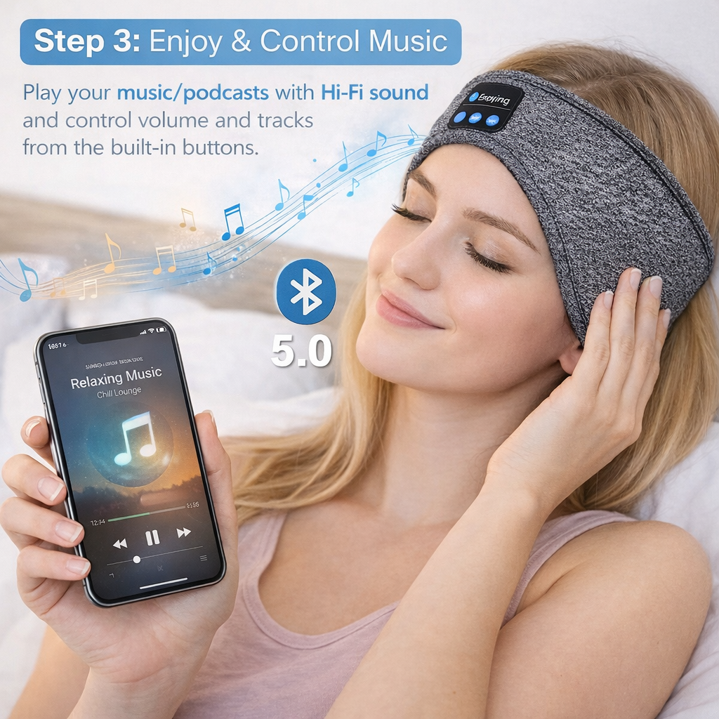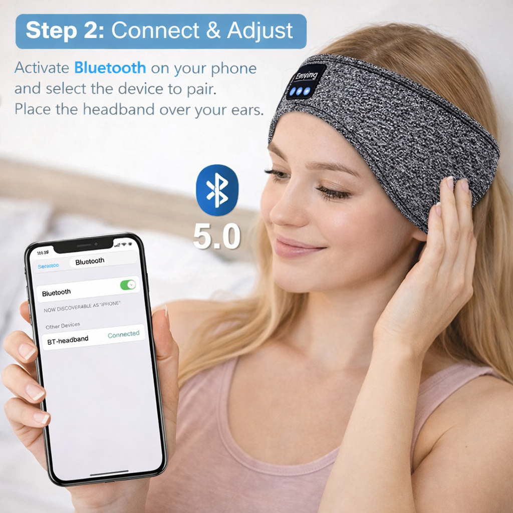 Activate Bluetooth on your phone, tablet, or computer and select the device from the list to pair it. Place the elastic headband over your head, comfortably covering your ears; it's ideal for sleeping, exercising, or using as an eye mask thanks to its soft, breathable fabric.